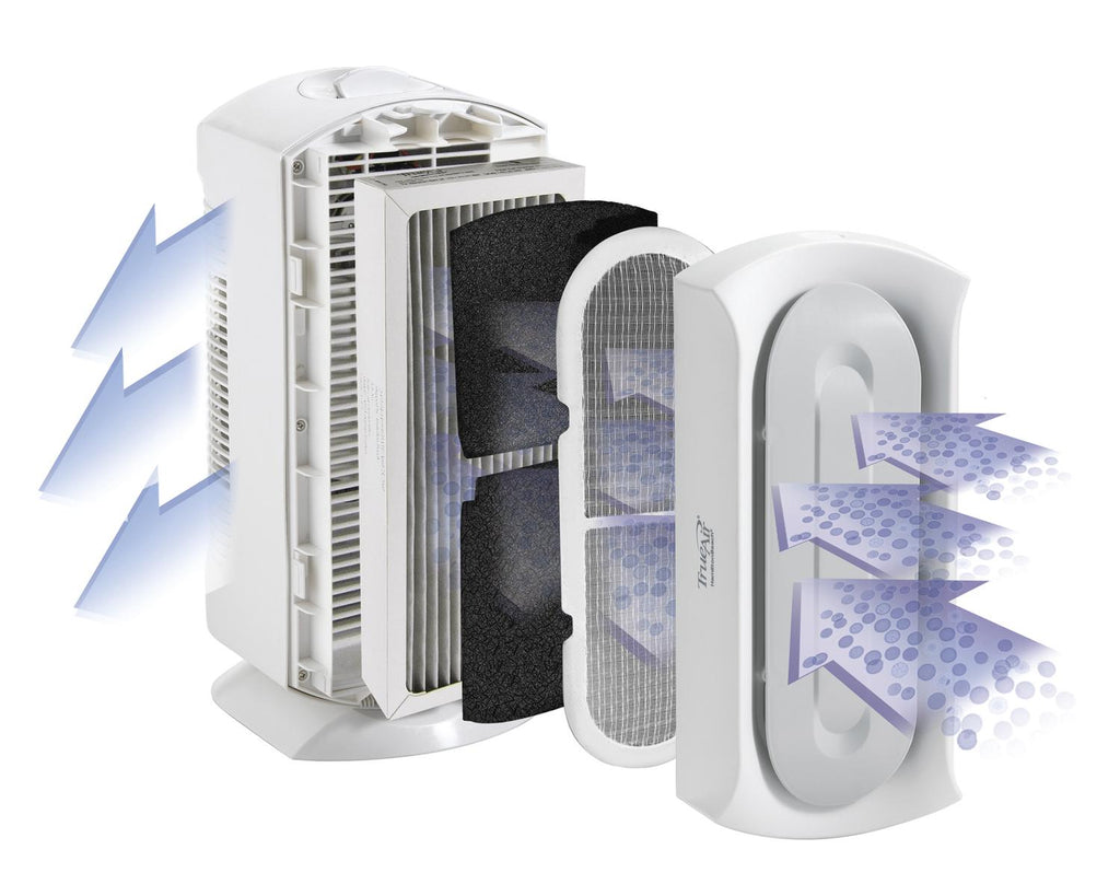 Purificador de aire compacto para mascotas TrueAir de Hamilton Beach Protección completa del aire para los dueños de mascotas. Elimine los molestos olores y la caspa de las mascotas con la tecnología de triple filtración del purificador de aire compacto para mascotas TrueAir de Hamilton Beach. Este sistema de alto rendimiento incluye un prefiltro permanente que captura el pelo de las mascotas y las partículas grandes, dos filtros de zeolita para eliminar los olores de las mascotas y un filtro permanente de grado HEPA para capturar partículas tan pequeñas como 3 micras. Los filtros permanentes se limpian fácilmente con una aspiradora, lo que minimiza el mantenimiento. No se deje engañar por su tamaño compacto y su funcionamiento ultrasilencioso: el purificador de aire compacto para mascotas TrueAir puede proporcionar una potente limpieza del aire en habitaciones grandes de hasta 13 metros cuadrados, lo que lo hace ideal para dormitorios, oficinas y salas de estar. No solo es compacto y silencioso, sino que también funciona en posición vertical u horizontal para una máxima versatilidad. Tecnología de eliminación de olores y filtración de caspa Respire mejor con aire que ha sido filtrado tres veces. Las tres etapas de filtración incluyen un prefiltro permanente para el pelo de mascotas y partículas grandes, dos filtros de zeolita de carbón reemplazables para eliminar los olores de las mascotas y, por último, un filtro permanente de grado HEPA al 99 % para capturar partículas pequeñas, como restos de ácaros del polvo en suspensión, esporas de moho, humo y polen. Ahorre tiempo y dinero con el filtro permanente de grado HEPA El purificador de aire compacto para mascotas TrueAir no arruinará su presupuesto: su prefiltro y su filtro HEPA son permanentes y nunca necesitan ser reemplazados. Protección completa del aire para dueños de mascotas El filtro permanente con filtración HEPA del 99 % ahorra hasta $49 al año en comparación con un filtro de reemplazo comparable Los 2 filtros de zeolita de carbono reemplazables eliminan los olores de las mascotas Rendimiento efectivo para habitaciones de 140 pies cuadrados Filtro HEPA permanente para aspirar 3 velocidades Úselo horizontal o verticalmente